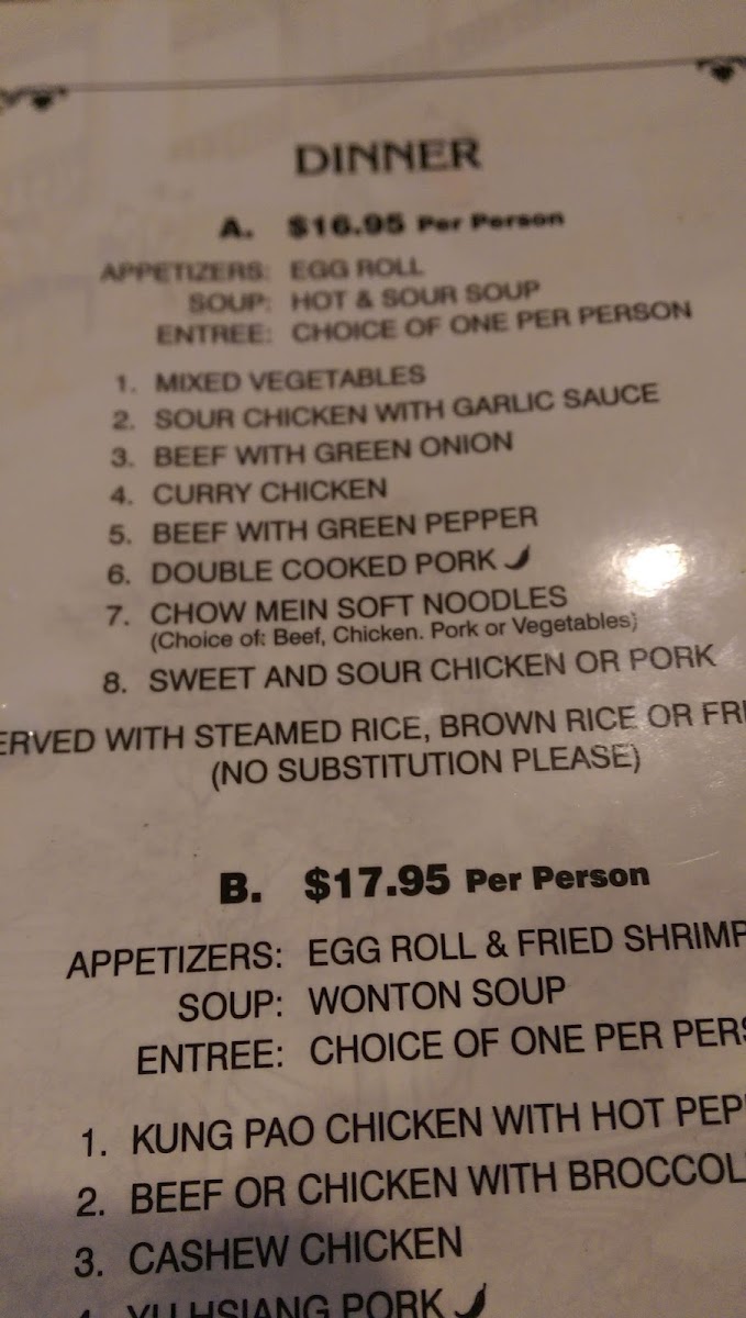 Includes: EGG ROLL and HOT & SOUR SOUP Choose One Rice: EGG FRIED RICE or WHITE RICE or BROWN RICE. Choose One Entree: 1.MIXED VEGETABLES 2.SOUR CHICKEN WITH GARLIC SAUCE 3.MONGOLIAN BEEF 4A.CURRY CHICKEN 4B.CURRY TOFU 5.BEEF WITH GREEN PEPPER 6.DOUBLE COOKED PORK 7A.CHOW MEIN - CHICKEN 7B.CHOW MEIN - BEEF 7C.CHOW MEIN - PORK 7D.CHOW MEIN - TOFU 7E.CHOW MEIN - VEGETABLE 8A.SWEET AND SOUR CHICKEN 8B.SWEET & SOUR PORK